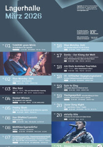 Die LAGERHALLE begreift sich als soziokulturelles Zentrum und bietet ein vielfältiges Kulturprogramm für Alle (Musik, Theater, Literatur, Kabarett, Vorträge, Filmkunstkino, etc.) Wir fördern die kulturelle und politische Bildung, ermöglichen Projekte, Vorträge und Seminare, Kreativangebote, offene Werkstätten. Hierzu gehört eine vernetzte Zusammenarbeit mit kulturellen Projekten, Vereinen, Initiativen und Institutionen in Osnabrück.